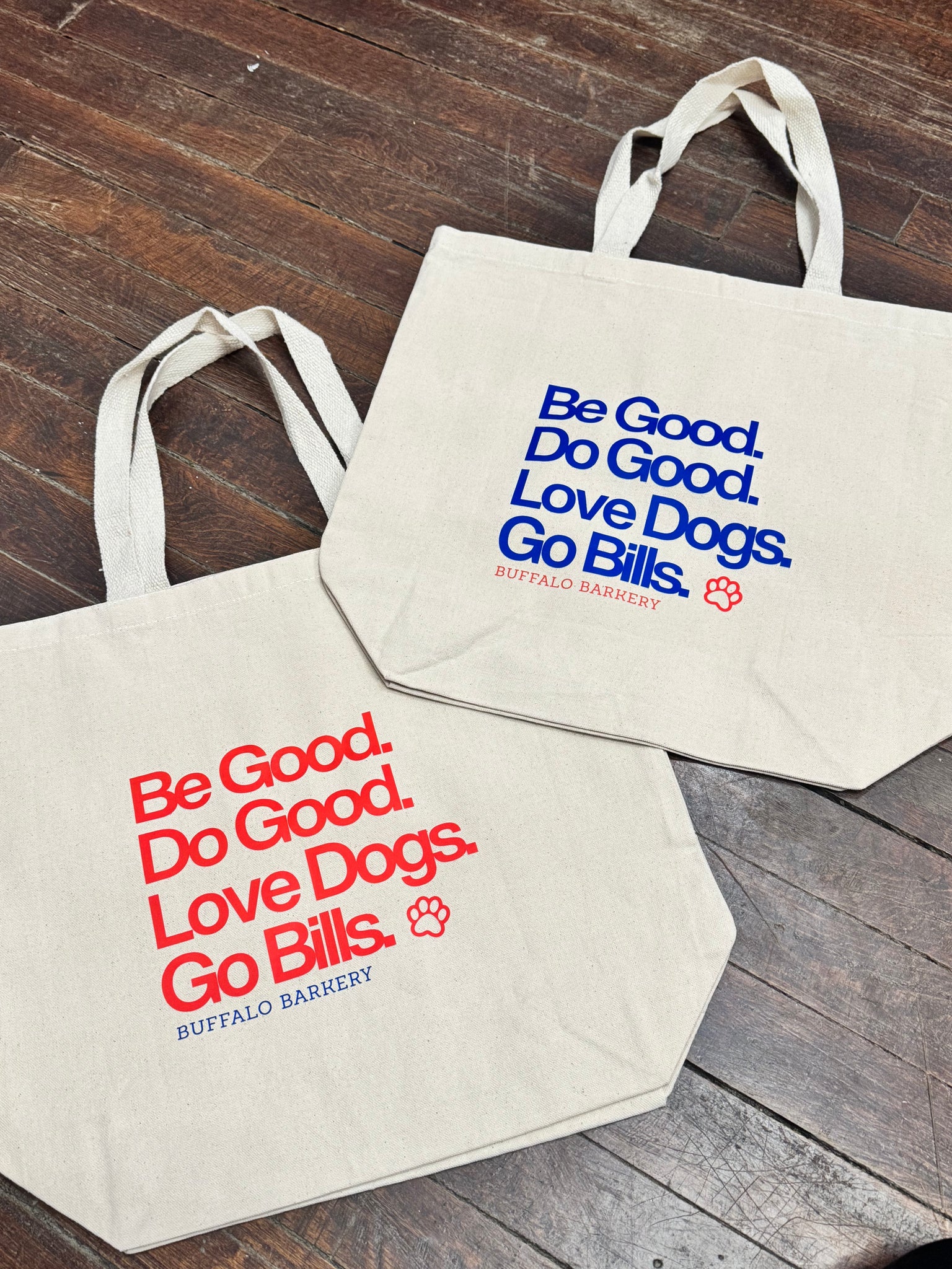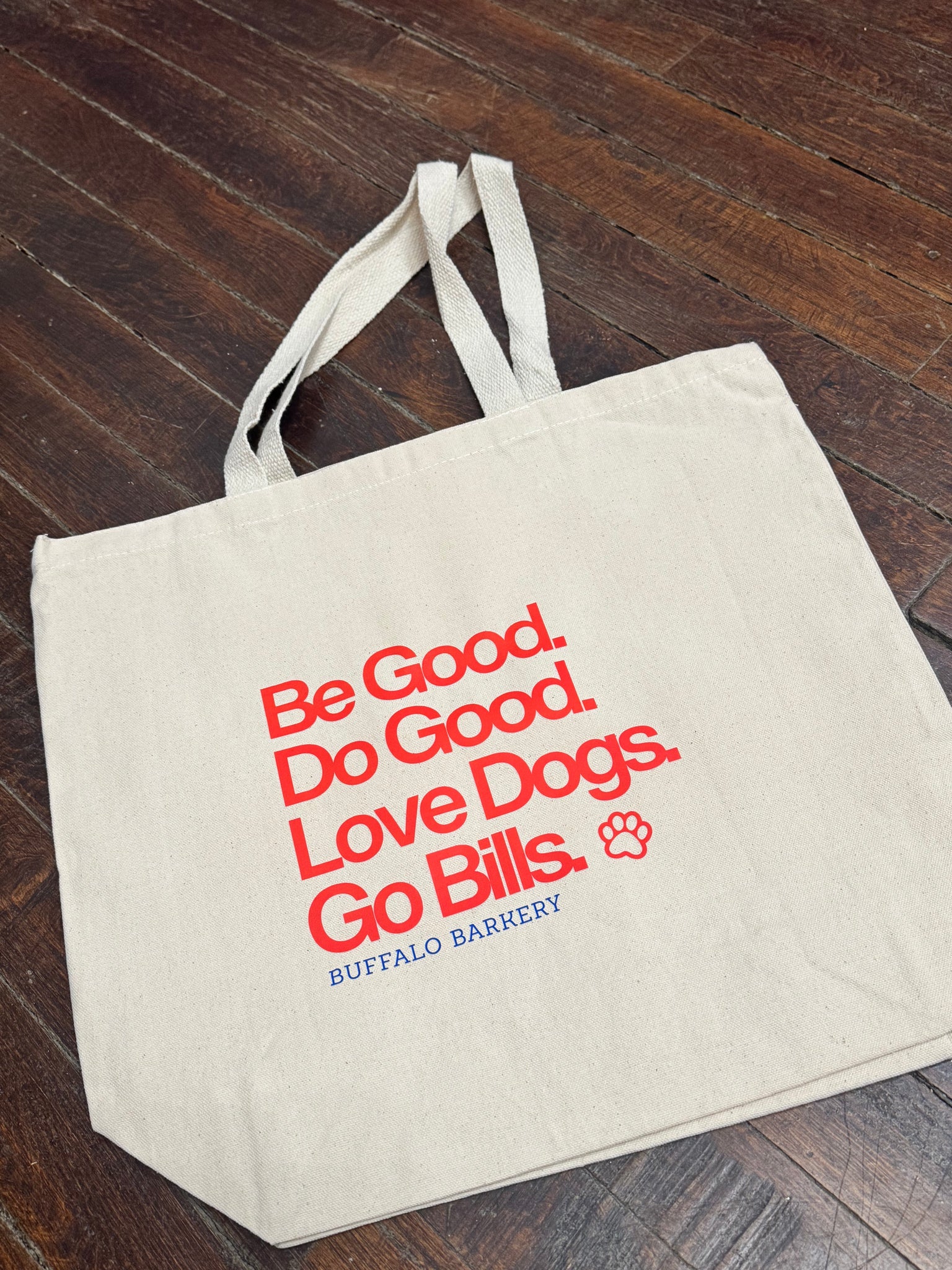 Carry your belongings with ease in this Three Pocket Canvas Tote Bag while showing off your love for Buffalo Football & dogs! It has a rectangular shape with a large main pocket and two braided handles on top. Two more pockets are sewn onto the back of the bag, allowing for even more storage and organization Plus, enjoy an exclusive perk: bring your tote to the store for any purchase and receive 5% off!